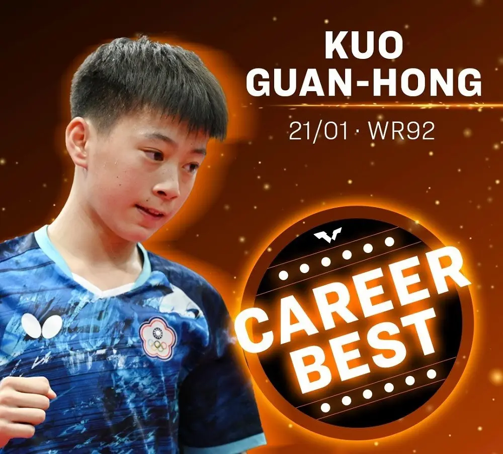郭冠宏打进WTT马斯开特挑战赛男单4强,缴出生涯代表作,本周世界排名一举狂升99名,挤进前100名,来到第92位,他以未满16岁4个月的年纪,刷新一哥林昀儒过去的16岁8个月纪录,成为中国台湾史上最年轻进入男单世界前百名的好手。